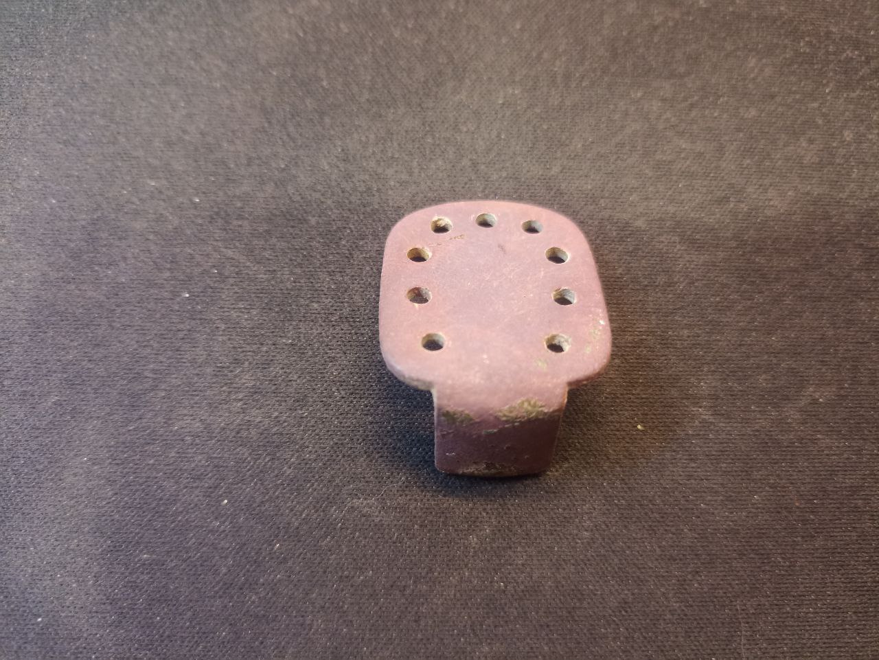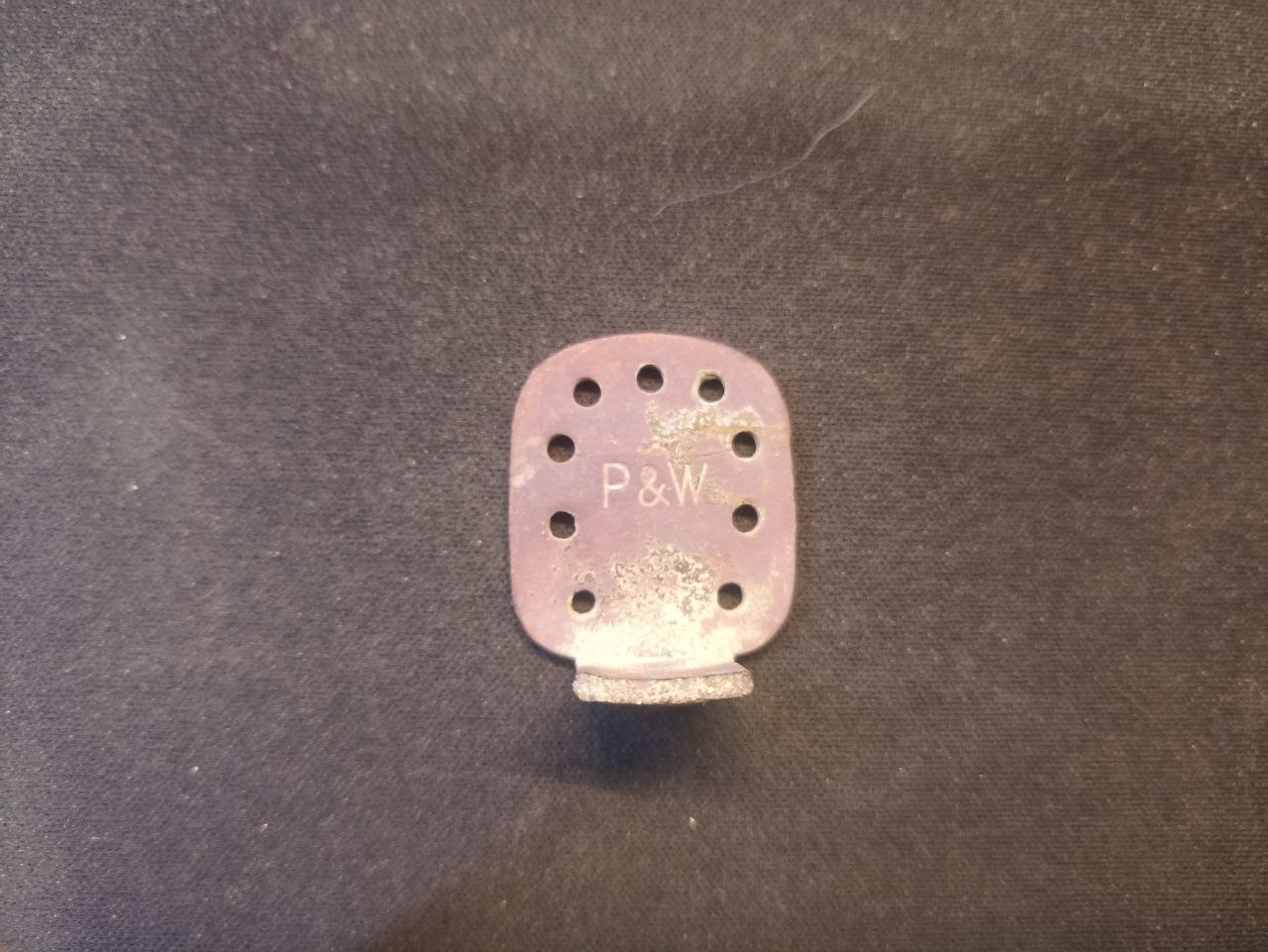Этот зацеп я поднял после дождя — на глубине ладони, зелёный от времени, медный, с едва читаемыми буквами P&W. Круглая часть, где когда-то держался ремень или пуговица, давно обломана — металл устал, но клеймо уцелело.