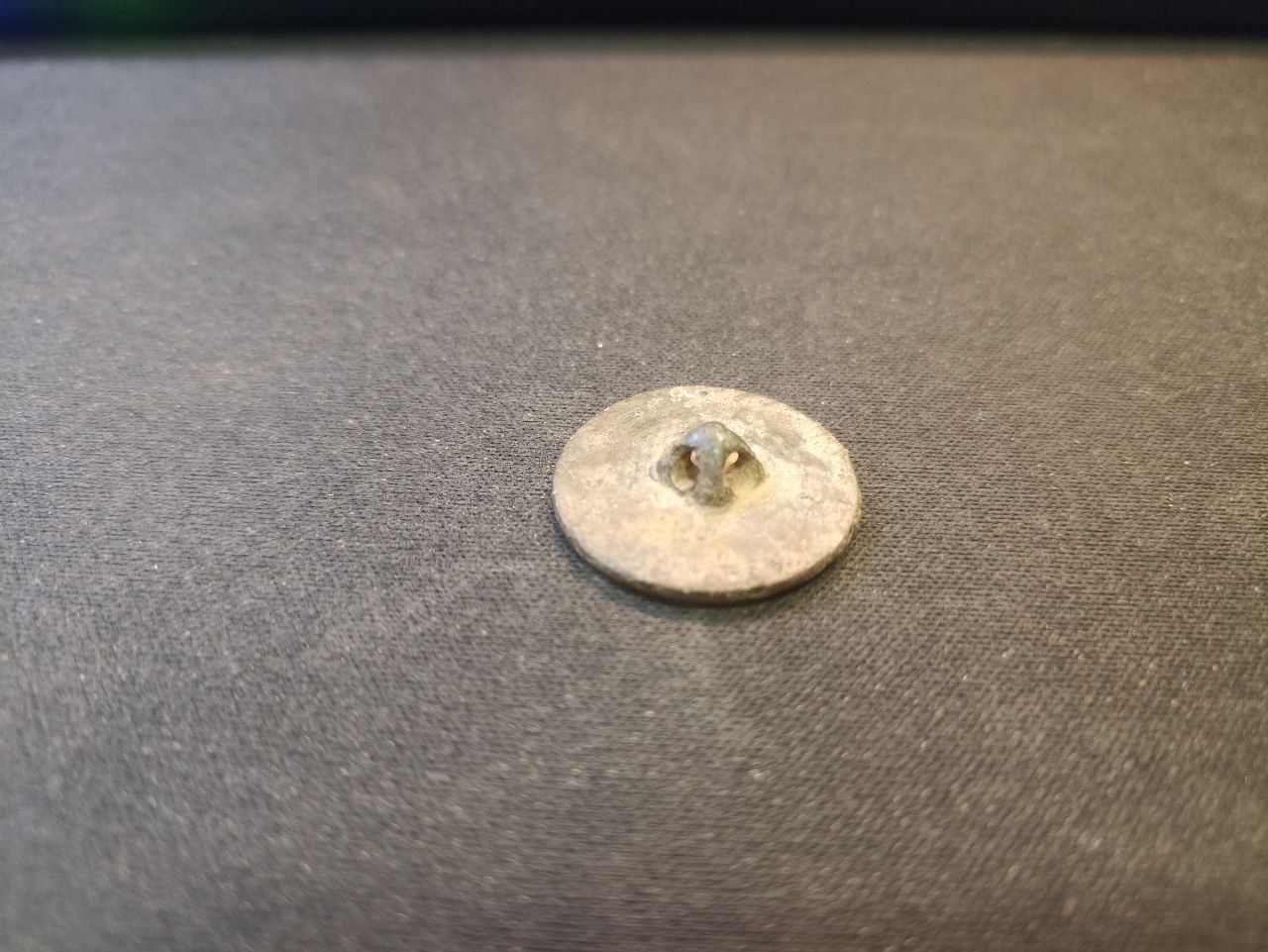 Пуговица сделана из латуни или цинкового сплава, под верхним слоем — мягкий блеск, словно металл всё ещё помнит пальцы того, кто застёгивал мундир.